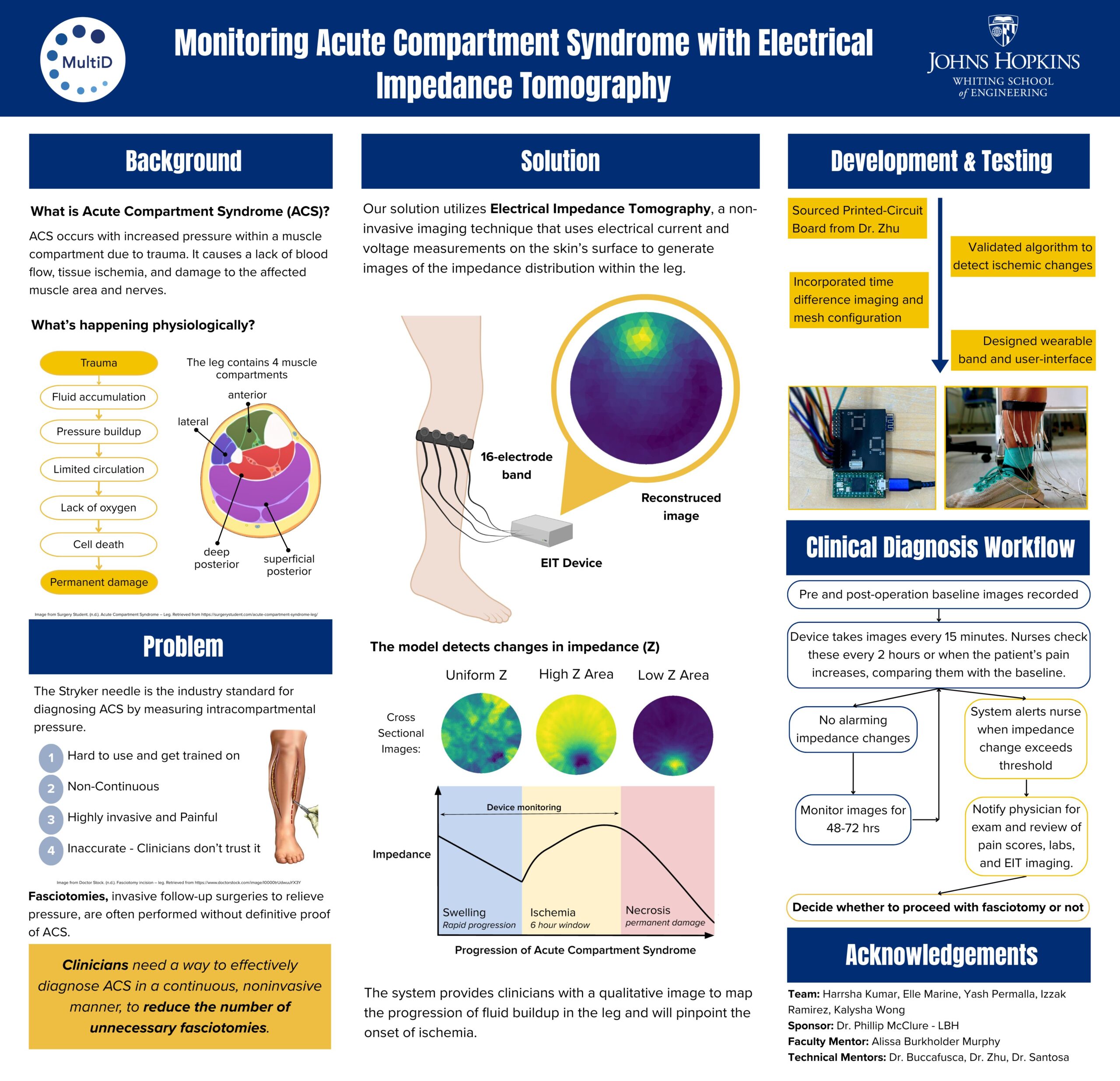 Our project aims to improve the diagnosis of Acute Compartment Syndrome (ACS), a condition caused by increased pressure in muscle compartments, which can lead to muscle necrosis, nerve damage, loss of function, and in severe cases, even amputation or death, if not treated promptly. The current standard of care—using the Stryker needle—is invasive, painful, and unreliable. We propose a non-invasive alternative using Electrical Impedance Tomography (EIT), which measures electrical signals on the skin’s surface to detect changes in tissue composition. By tracking impedance patterns, our system can monitor fluid buildup and ischemia progression in real time, providing clinicians with a visual tool to identify the critical window before tissue necrosis.