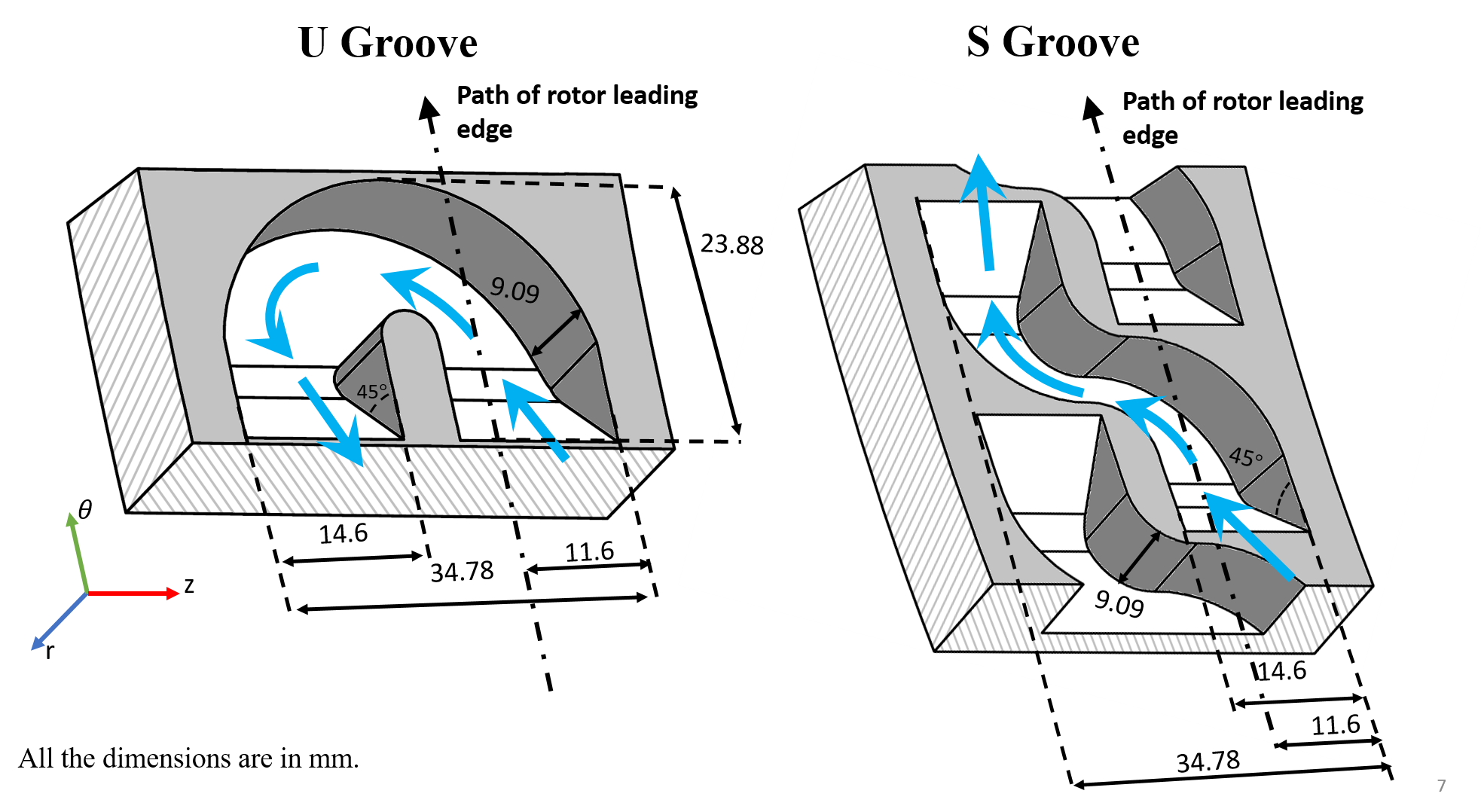 Groove Shape Optimization: Investigate the effect of different groove geometry with flow entering the groove at a similar orientation but exiting at different directions. This would decouple the effect of periodic modulation of incidence angle from the TLV ingestion.