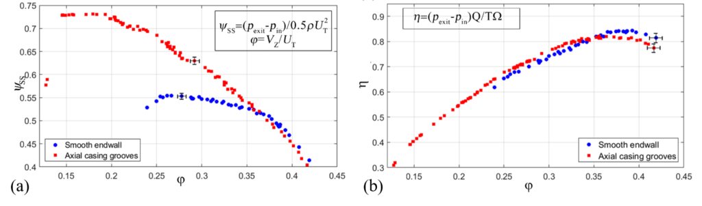 Delaying Compressor Stall: Semicircular Axial Casing Grooves were used to delay the stall. It achieved a 40% reduction in flow coefficient at the onset of stall, but its peak efficiency decreases by 2.4%. Detailed Particle Image Velocimetry measurements in the tip region show that the semicircular ACGs: