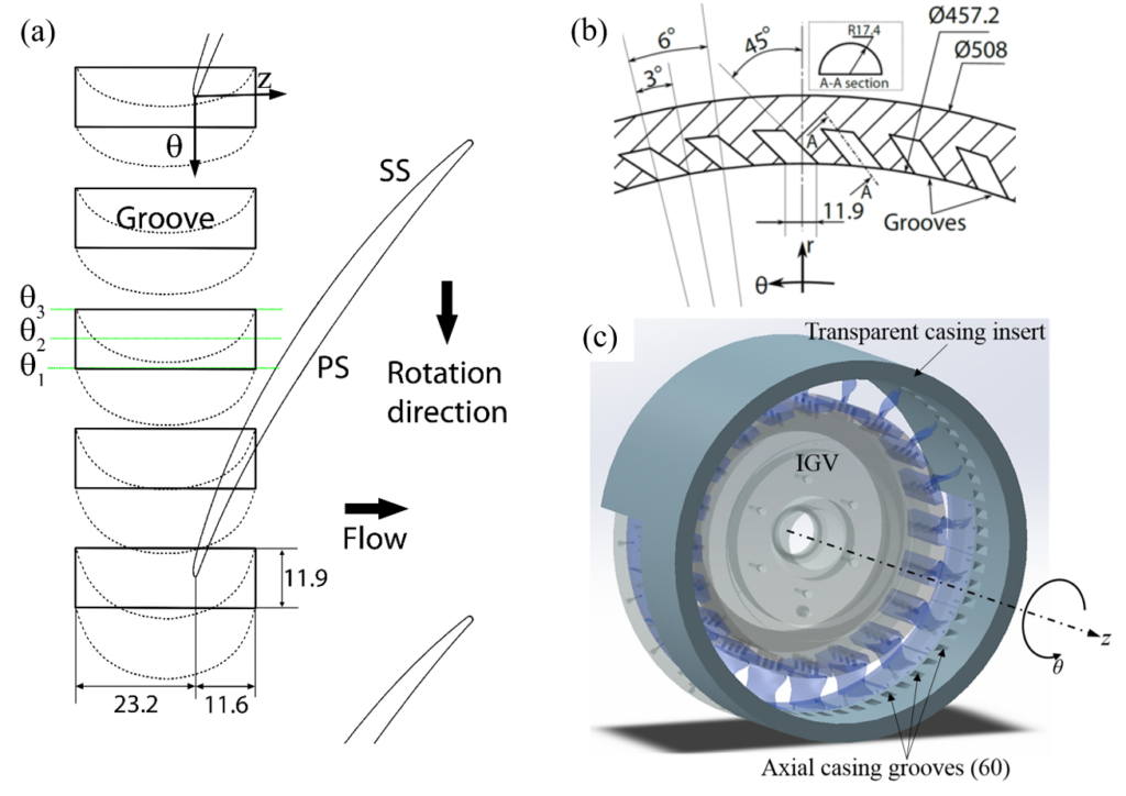 Geometries of the axial casing grooves: (a) a radial view, (b) streamwise view (looking upstream) and (c) perspective view