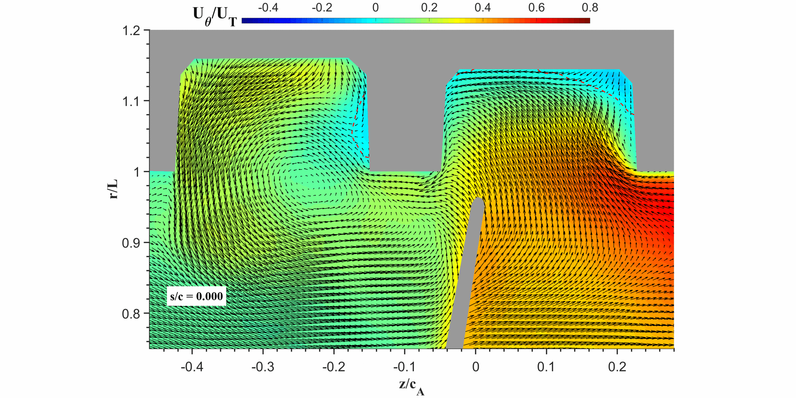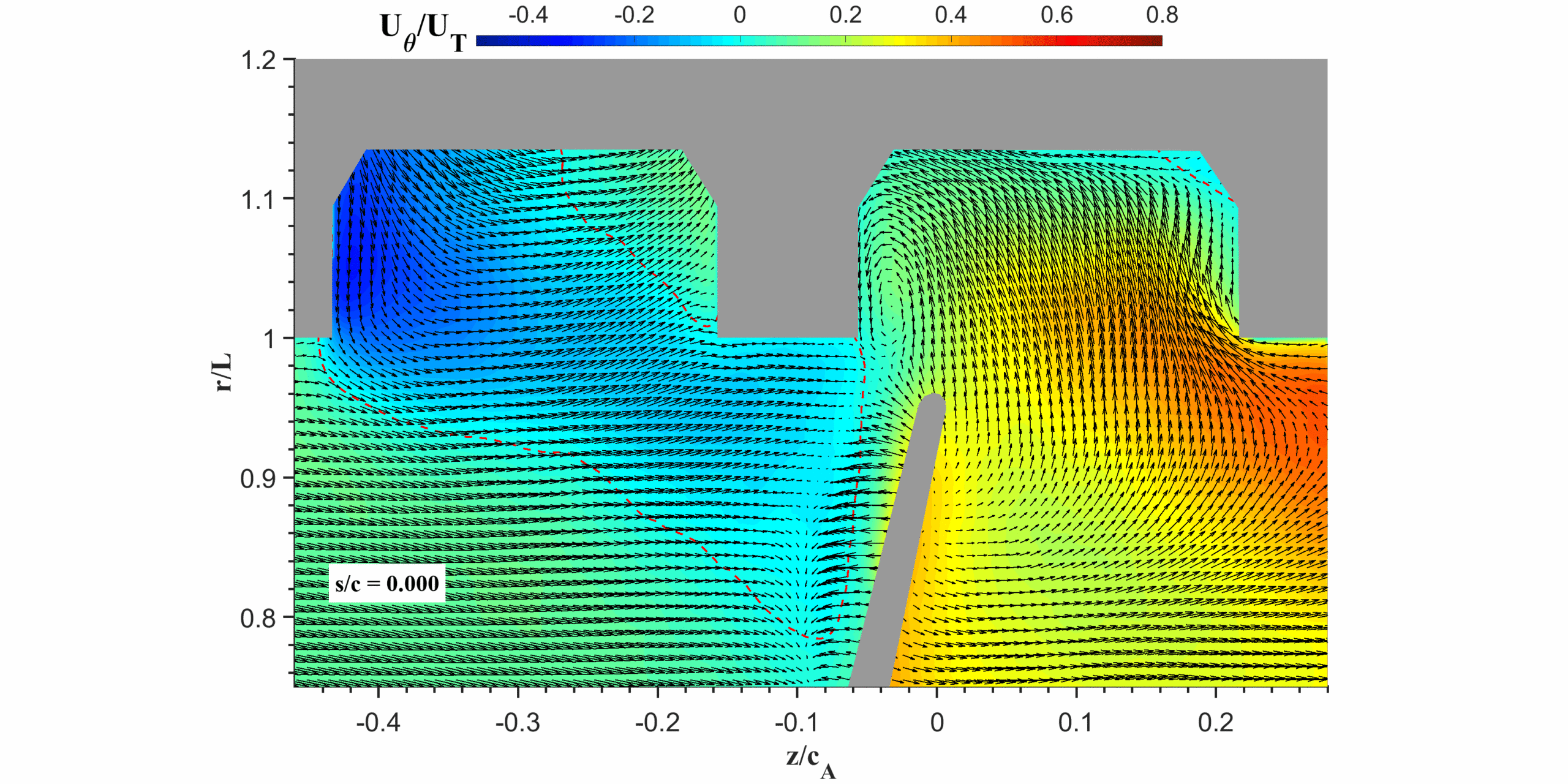 Ensemble-averaged in-plane velocity vectors ( Uz, Uθ) superimposed on color contours of the radial velocity component in R2 plane at flowrate = 0.25. The values of s/c indicate the intersection of the M1 plane with the blade chord.