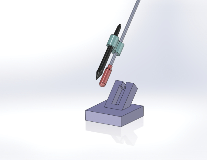 The team’s solution was to create a 3D-printed plastic base that is mounted on the artist’s desk and holds the eraser. Keplinger uses his head to direct the stylus into the base, snapping the eraser on and off as needed.